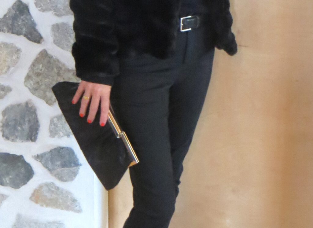 Ich trage einen schlichten Feinstrickpullover (Marke unbekannt, Kaufhof Freiburg), eine Stoffhose (Drykorn, Kaiser Freiburg), Stiefeletten, die nicht zu hoch sind (Kennel & Schmenger, Breuninger Freiburg). Als Accessoire dient mir eine Clutch (Boutique Paris Passion, Freiburg), die ich bereits mehrere Jahre benutze. Felljacke gekauft über Ebay.