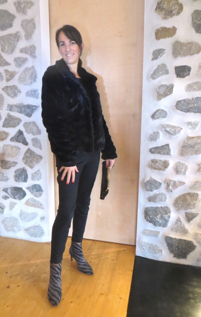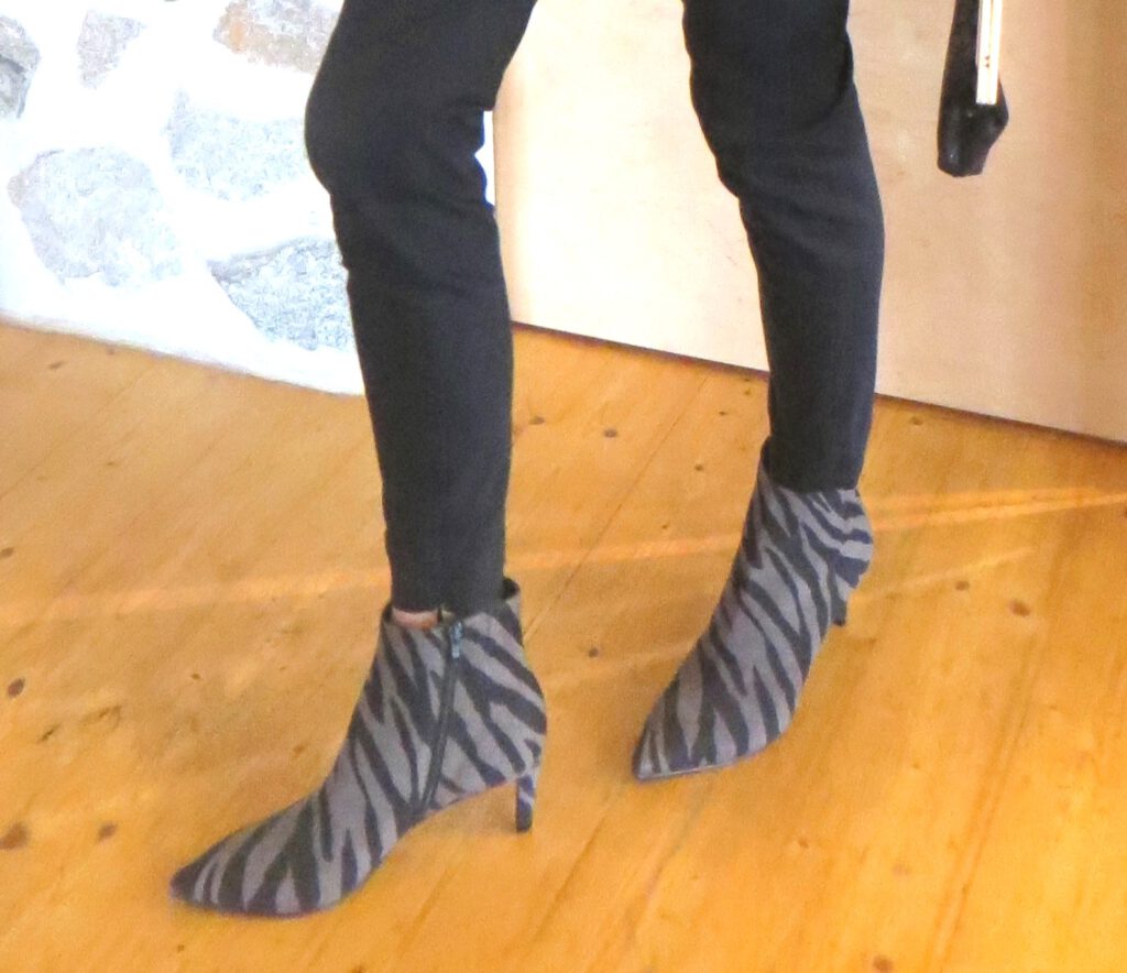 In diesem Outfit kombiniere ich das Zebra Muster der Stiefeletten mit dem Plüsch-Fell der Jacke. Der Glanz der Jacke wertet das ansonst schlichte Aussehen auf – ich fühle mich gleich viel edler, wenn ich die Jacke anziehe.